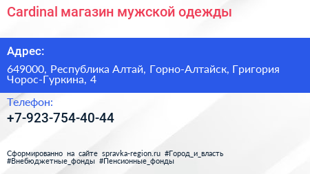 Cardinal, магазин мужской одежды по адресу 649000, Республика Алтай, Горно-Алтайск, Григория Чорос-Гуркина, 4 в дальнейшем Организация, размещена в следующих категориях: