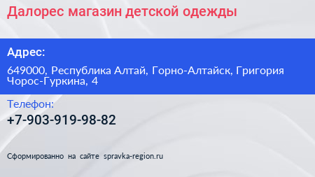 Далорес, магазин детской одежды по адресу 649000, Республика Алтай, Горно-Алтайск, Григория Чорос-Гуркина, 4 в дальнейшем Организация, размещена в следующих категориях:
