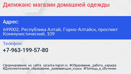 Дилижанс, магазин домашней одежды по адресу 649002, Республика Алтай, Горно-Алтайск, проспект Коммунистический, 109 в дальнейшем Организация, размещена в следующих категориях: