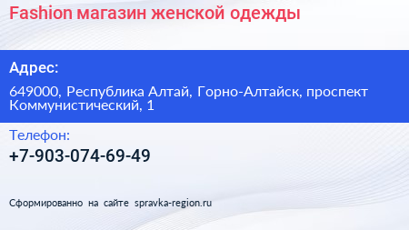 Fashion, магазин женской одежды по адресу 649000, Республика Алтай, Горно-Алтайск, проспект Коммунистический, 1 в дальнейшем Организация, размещена в следующих категориях: