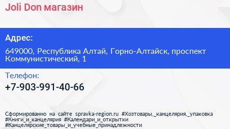 Joli`Don, магазин по адресу 649000, Республика Алтай, Горно-Алтайск, проспект Коммунистический, 1 в дальнейшем Организация, размещена в следующих категориях:
