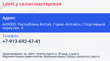 LoveLy, салон-мастерская по адресу 649000, Республика Алтай, Горно-Алтайск, Спортивный переулок, 4 в дальнейшем Организация, размещена в следующих категориях: