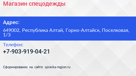 Магазин спецодежды по адресу 649002, Республика Алтай, Горно-Алтайск, Поселковая, 1/3 в дальнейшем Организация, размещена в следующих категориях: