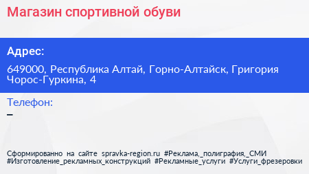 Магазин спортивной обуви по адресу 649000, Республика Алтай, Горно-Алтайск, Григория Чорос-Гуркина, 4 в дальнейшем Организация, размещена в следующих категориях: