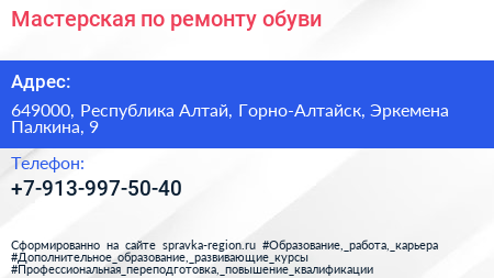 Мастерская по ремонту обуви по адресу 649000, Республика Алтай, Горно-Алтайск, Эркемена Палкина, 9 в дальнейшем Организация, размещена в следующих категориях: