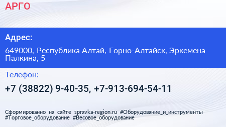 АРГО по адресу 649000, Республика Алтай, Горно-Алтайск, Эркемена Палкина, 5 в дальнейшем Организация, размещена в следующих категориях: