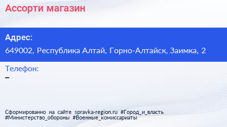 Ассорти, магазин по адресу 649002, Республика Алтай, Горно-Алтайск, Заимка, 2 в дальнейшем Организация, размещена в следующих категориях: