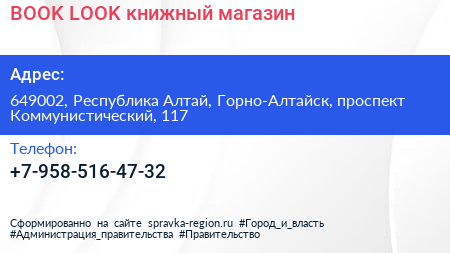 BOOK-LOOK, книжный магазин по адресу 649002, Республика Алтай, Горно-Алтайск, проспект Коммунистический, 117 в дальнейшем Организация, размещена в следующих категориях: