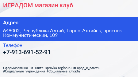 ИГРАДОМ, магазин-клуб по адресу 649002, Республика Алтай, Горно-Алтайск, проспект Коммунистический, 109 в дальнейшем Организация, размещена в следующих категориях: