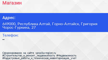 Магазин по адресу 649000, Республика Алтай, Горно-Алтайск, Григория Чорос-Гуркина, 27 в дальнейшем Организация, размещена в следующих категориях: