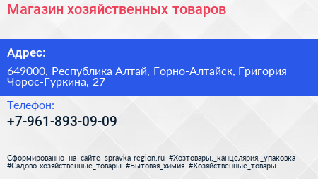 Магазин хозяйственных товаров по адресу 649000, Республика Алтай, Горно-Алтайск, Григория Чорос-Гуркина, 27 в дальнейшем Организация, размещена в следующих категориях:
