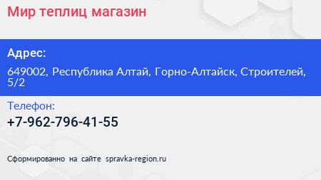 Мир теплиц, магазин по адресу 649002, Республика Алтай, Горно-Алтайск, Строителей, 5/2 в дальнейшем Организация, размещена в следующих категориях: