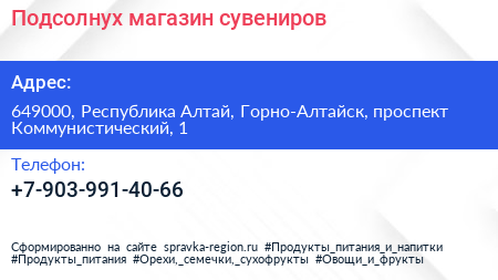 Подсолнух, магазин сувениров по адресу 649000, Республика Алтай, Горно-Алтайск, проспект Коммунистический, 1 в дальнейшем Организация, размещена в следующих категориях: