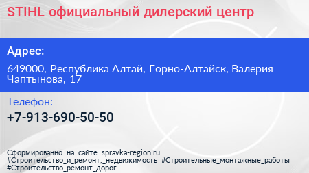 STIHL, официальный дилерский центр по адресу 649000, Республика Алтай, Горно-Алтайск, Валерия Чаптынова, 17 в дальнейшем Организация, размещена в следующих категориях: