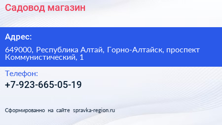 Садовод, магазин по адресу 649000, Республика Алтай, Горно-Алтайск, проспект Коммунистический, 1 в дальнейшем Организация, размещена в следующих категориях: