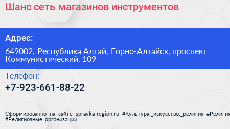 Шанс, сеть магазинов инструментов по адресу 649002, Республика Алтай, Горно-Алтайск, проспект Коммунистический, 109 в дальнейшем Организация, размещена в следующих категориях:
