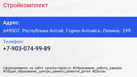 Стройкомплект по адресу 649007, Республика Алтай, Горно-Алтайск, Ленина, 199 в дальнейшем Организация, размещена в следующих категориях: