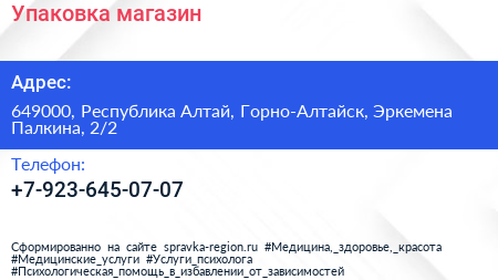Упаковка, магазин по адресу 649000, Республика Алтай, Горно-Алтайск, Эркемена Палкина, 2/2 в дальнейшем Организация, размещена в следующих категориях: