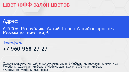 ЦветкоФФ, салон цветов по адресу 649006, Республика Алтай, Горно-Алтайск, проспект Коммунистический, 51 в дальнейшем Организация, размещена в следующих категориях: