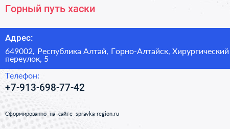 Горный путь хаски по адресу 649002, Республика Алтай, Горно-Алтайск, Хирургический переулок, 5 в дальнейшем Организация, размещена в следующих категориях: