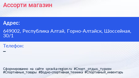 Ассорти, магазин по адресу 649002, Республика Алтай, Горно-Алтайск, Шоссейная, 30/1 в дальнейшем Организация, размещена в следующих категориях: