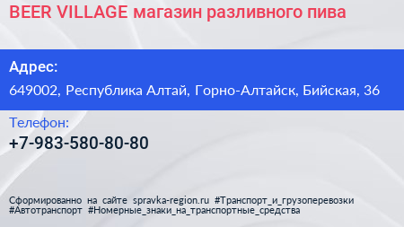 BEER VILLAGE, магазин разливного пива по адресу 649002, Республика Алтай, Горно-Алтайск, Бийская, 36 в дальнейшем Организация, размещена в следующих категориях: