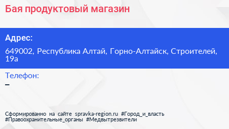 Бая, продуктовый магазин по адресу 649002, Республика Алтай, Горно-Алтайск, Строителей, 19а в дальнейшем Организация, размещена в следующих категориях: