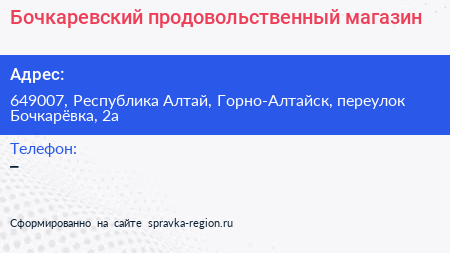 Бочкаревский, продовольственный магазин по адресу 649007, Республика Алтай, Горно-Алтайск, переулок Бочкарёвка, 2а в дальнейшем Организация, размещена в следующих категориях:
