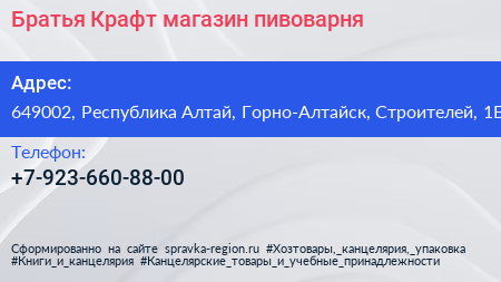 Братья Крафт, магазин-пивоварня по адресу 649002, Республика Алтай, Горно-Алтайск, Строителей, 1Б в дальнейшем Организация, размещена в следующих категориях: