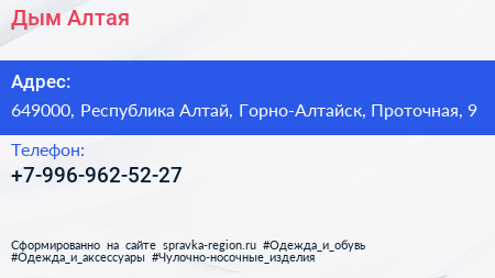 Дым Алтая по адресу 649000, Республика Алтай, Горно-Алтайск, Проточная, 9 в дальнейшем Организация, размещена в следующих категориях: