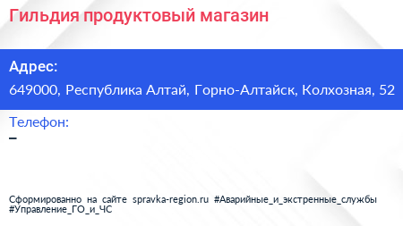 Гильдия, продуктовый магазин по адресу 649000, Республика Алтай, Горно-Алтайск, Колхозная, 52 в дальнейшем Организация, размещена в следующих категориях: