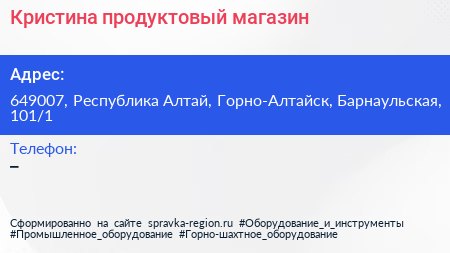 Кристина, продуктовый магазин по адресу 649007, Республика Алтай, Горно-Алтайск, Барнаульская, 101/1 в дальнейшем Организация, размещена в следующих категориях: