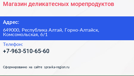 Магазин деликатесных морепродуктов по адресу 649000, Республика Алтай, Горно-Алтайск, Комсомольская, 6/1 в дальнейшем Организация, размещена в следующих категориях: