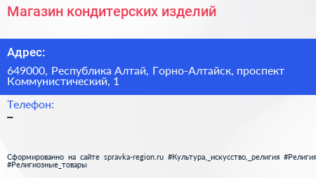 Магазин кондитерских изделий по адресу 649000, Республика Алтай, Горно-Алтайск, проспект Коммунистический, 1 в дальнейшем Организация, размещена в следующих категориях: