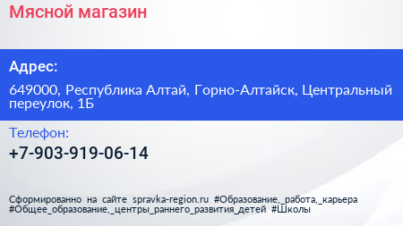 Мясной магазин по адресу 649000, Республика Алтай, Горно-Алтайск, Центральный переулок, 1Б в дальнейшем Организация, размещена в следующих категориях: