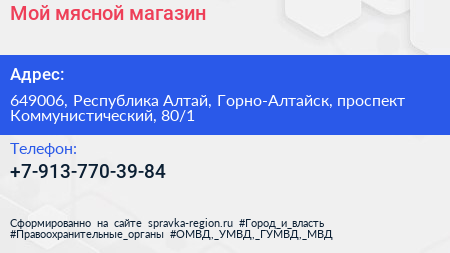 Мой мясной, магазин по адресу 649006, Республика Алтай, Горно-Алтайск, проспект Коммунистический, 80/1 в дальнейшем Организация, размещена в следующих категориях: