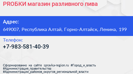 PRОБКИ, магазин разливного пива по адресу 649007, Республика Алтай, Горно-Алтайск, Ленина, 199 в дальнейшем Организация, размещена в следующих категориях: