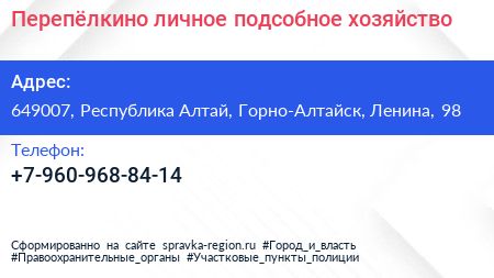 Перепёлкино, личное подсобное хозяйство по адресу 649007, Республика Алтай, Горно-Алтайск, Ленина, 98 в дальнейшем Организация, размещена в следующих категориях: