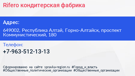 Rifero, кондитерская фабрика по адресу 649002, Республика Алтай, Горно-Алтайск, проспект Коммунистический, 180 в дальнейшем Организация, размещена в следующих категориях: