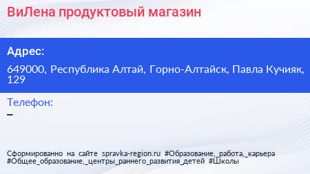 ВиЛена, продуктовый магазин по адресу 649000, Республика Алтай, Горно-Алтайск, Павла Кучияк, 129 в дальнейшем Организация, размещена в следующих категориях: