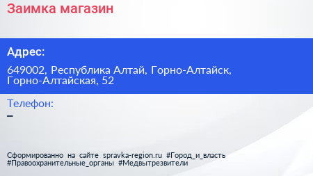 Заимка, магазин по адресу 649002, Республика Алтай, Горно-Алтайск, Горно-Алтайская, 52 в дальнейшем Организация, размещена в следующих категориях: