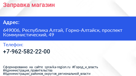 Заправка, магазин по адресу 649006, Республика Алтай, Горно-Алтайск, проспект Коммунистический, 49 в дальнейшем Организация, размещена в следующих категориях: