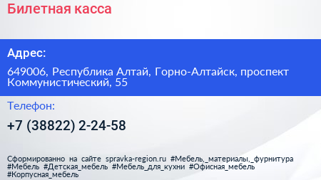 Билетная касса по адресу 649006, Республика Алтай, Горно-Алтайск, проспект Коммунистический, 55 в дальнейшем Организация, размещена в следующих категориях: