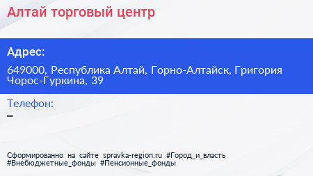 Алтай, торговый центр по адресу 649000, Республика Алтай, Горно-Алтайск, Григория Чорос-Гуркина, 39 в дальнейшем Организация, размещена в следующих категориях: