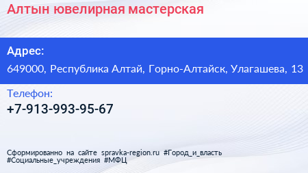 Алтын, ювелирная мастерская по адресу 649000, Республика Алтай, Горно-Алтайск, Улагашева, 13 в дальнейшем Организация, размещена в следующих категориях:
