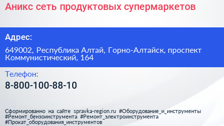Аникс, сеть продуктовых супермаркетов по адресу 649002, Республика Алтай, Горно-Алтайск, проспект Коммунистический, 164 в дальнейшем Организация, размещена в следующих категориях: