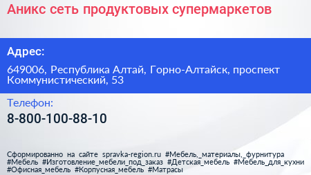 Аникс, сеть продуктовых супермаркетов по адресу 649006, Республика Алтай, Горно-Алтайск, проспект Коммунистический, 53 в дальнейшем Организация, размещена в следующих категориях: