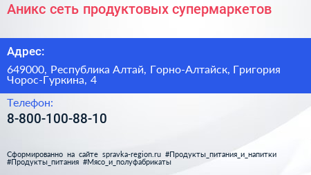 Аникс, сеть продуктовых супермаркетов по адресу 649000, Республика Алтай, Горно-Алтайск, Григория Чорос-Гуркина, 4 в дальнейшем Организация, размещена в следующих категориях: