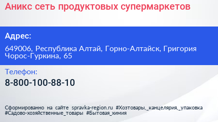 Аникс, сеть продуктовых супермаркетов по адресу 649006, Республика Алтай, Горно-Алтайск, Григория Чорос-Гуркина, 65 в дальнейшем Организация, размещена в следующих категориях: