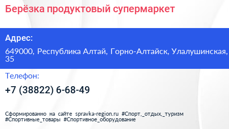 Берёзка, продуктовый супермаркет по адресу 649000, Республика Алтай, Горно-Алтайск, Улалушинская, 35 в дальнейшем Организация, размещена в следующих категориях: